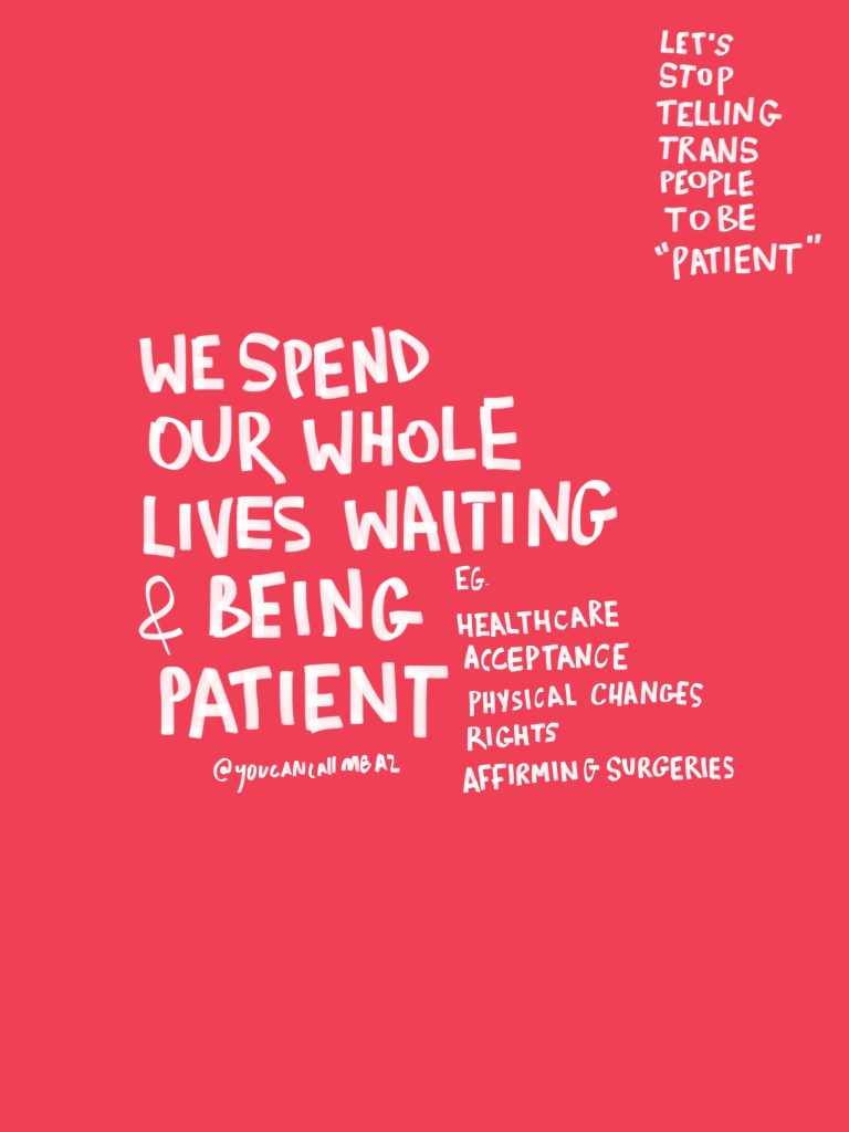 & although intentions may not be to harm, telling trans people to “be patient” is rarely helpful. It’s something I’ve been told many times throughout my transition and each time it feels as though I’m not understood.
