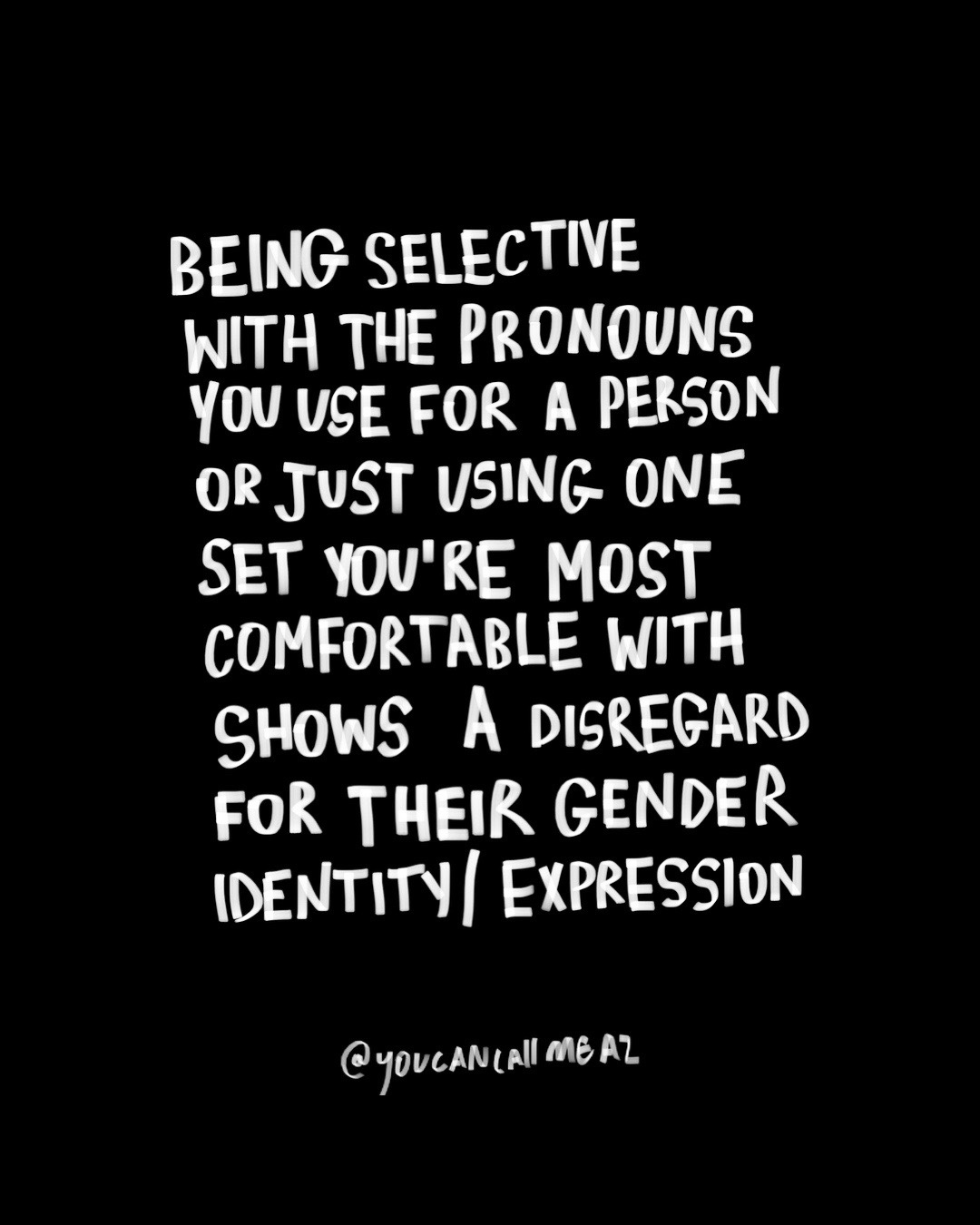 being selective with the pronouns you use for a person, or just using one set you’re most comfortable with, shows a disregard for their gender identity / expression.