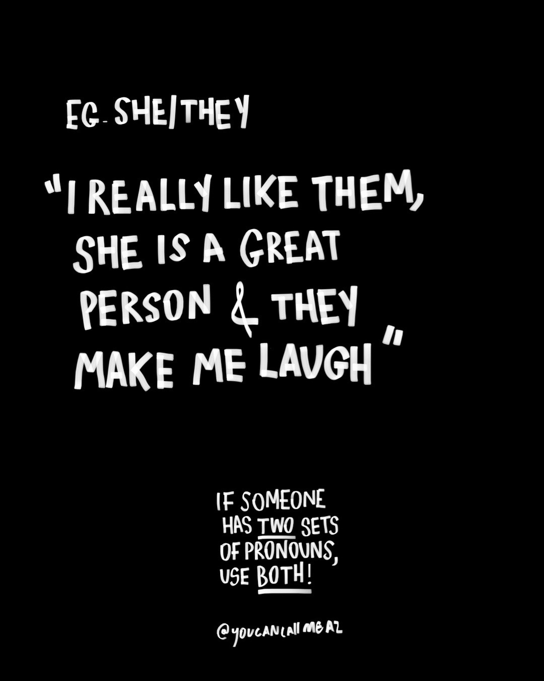 if someone has multiple sets of pronouns, ask how they would like you to use them. if in doubt, use them all interchangeably – the same goes for people with more than 2 sets of pronouns.