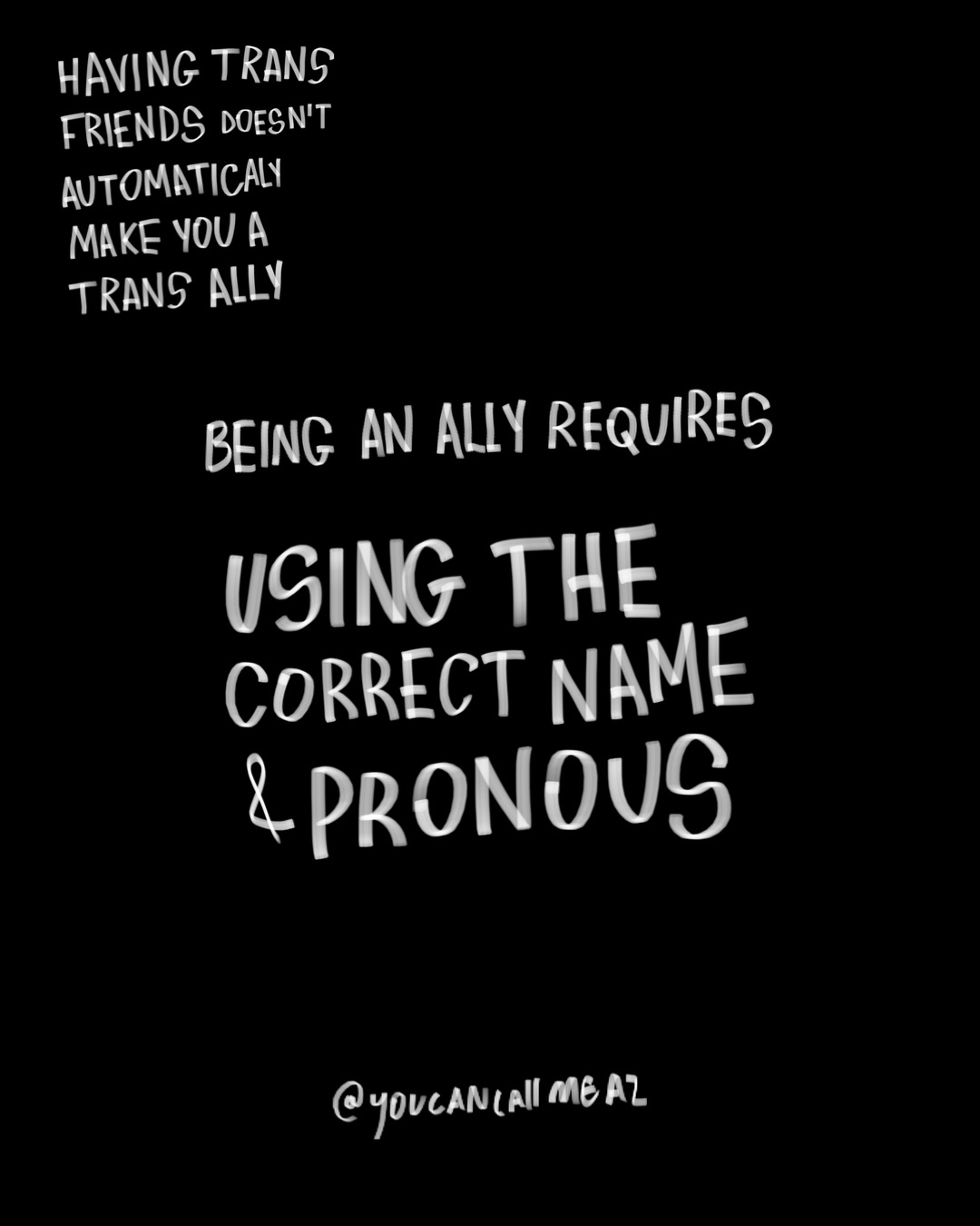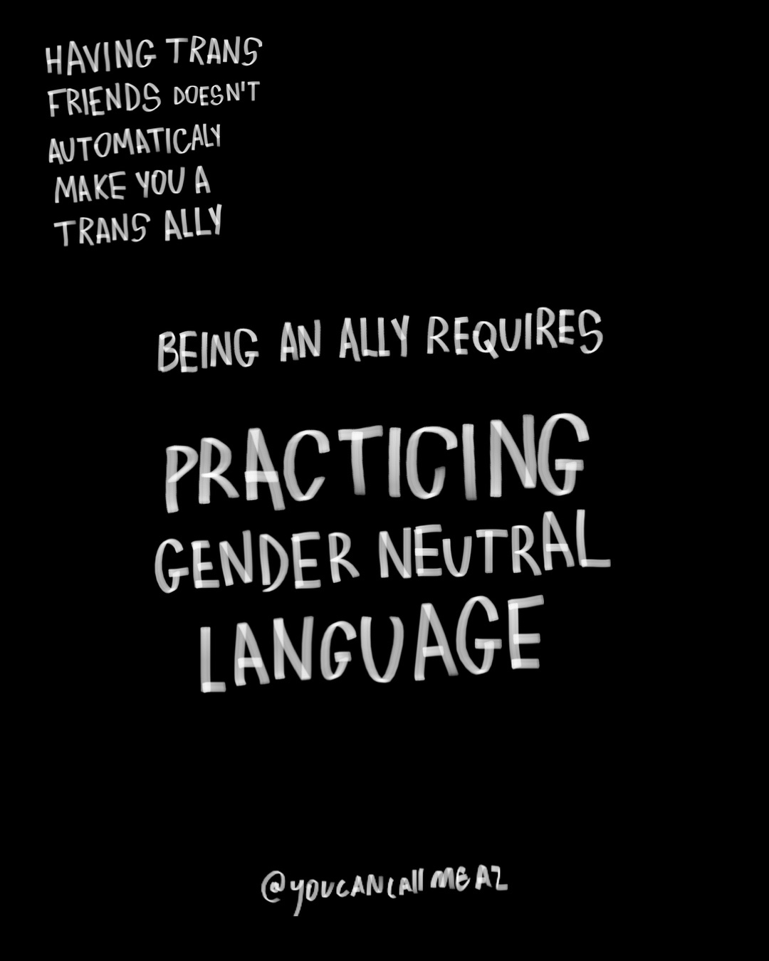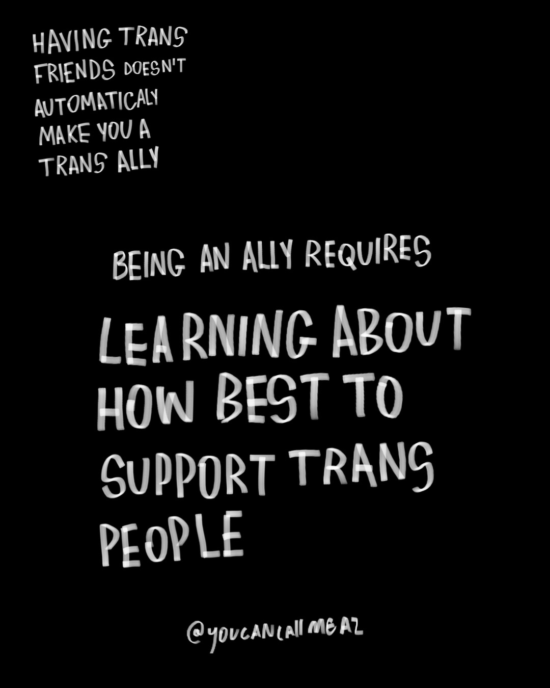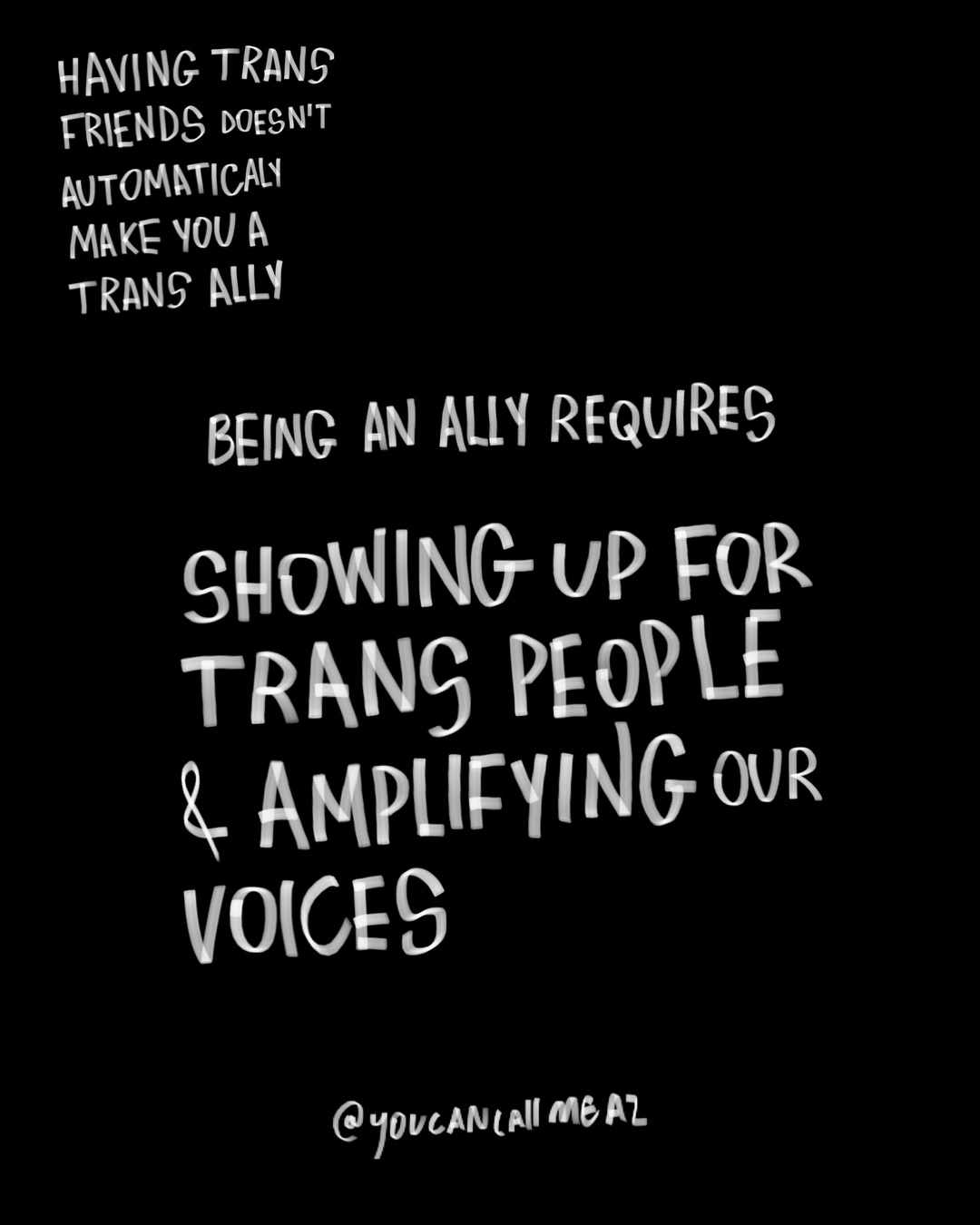 being an ally requires listening to trans people, using the correct name & pronouns, practicing gender neutral language, learning how best to support trans people, showing up for us & amplifying our voices.