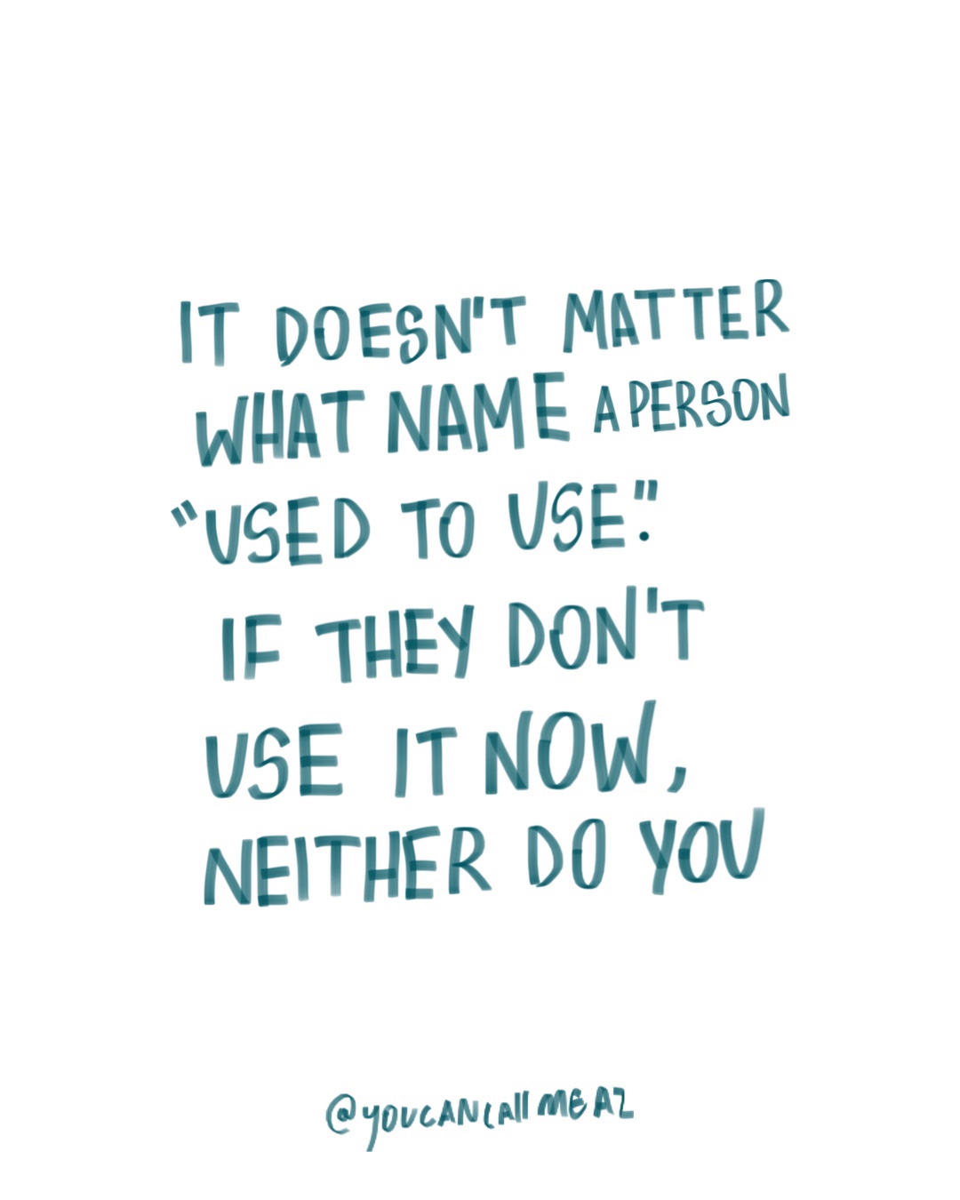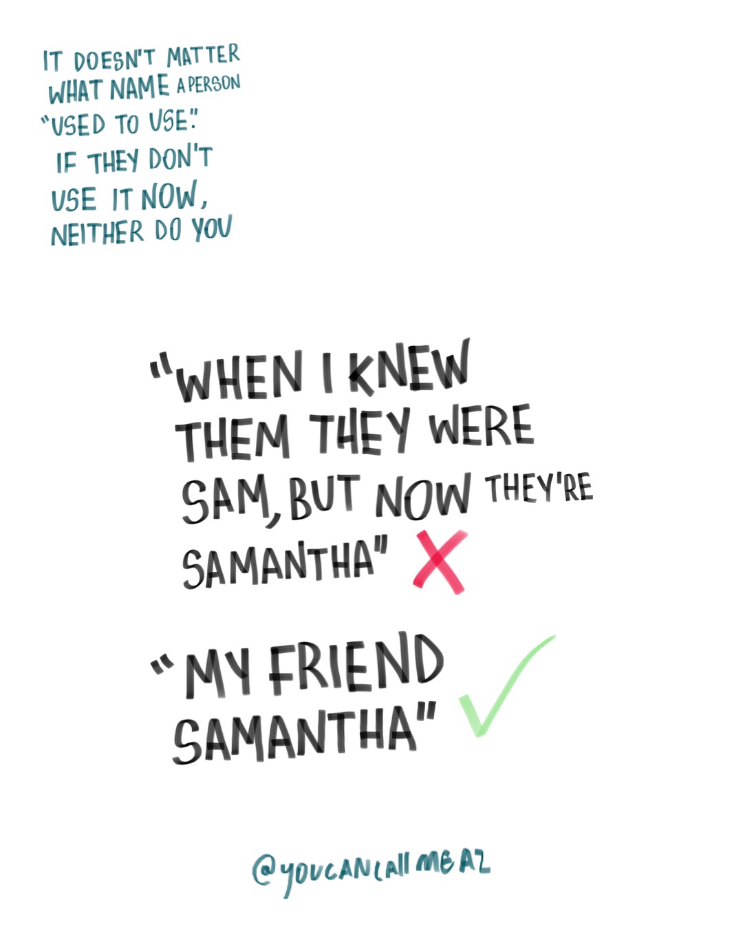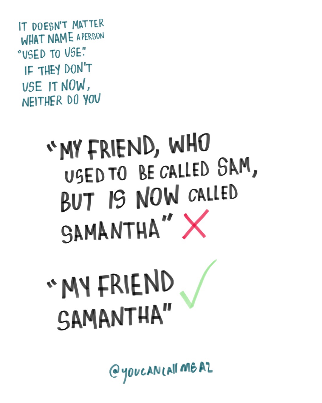 - eg. instead of saying “my friend, who used to be called Sam but is now called Samantha” / “i knew them as Sam but now they’re called Samantha”