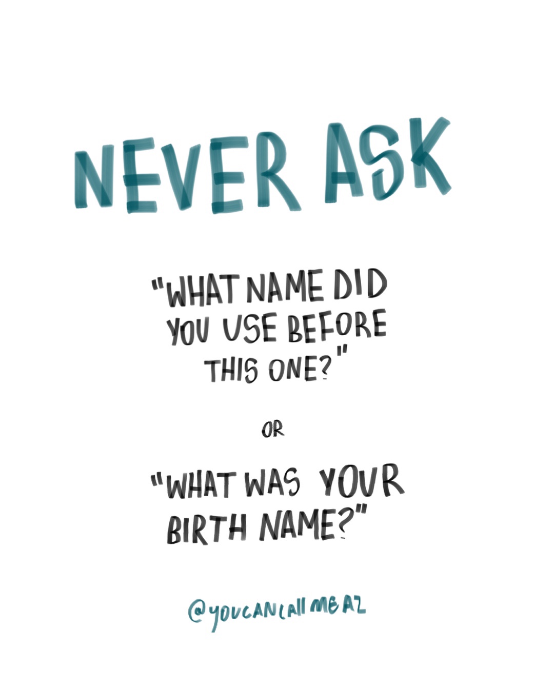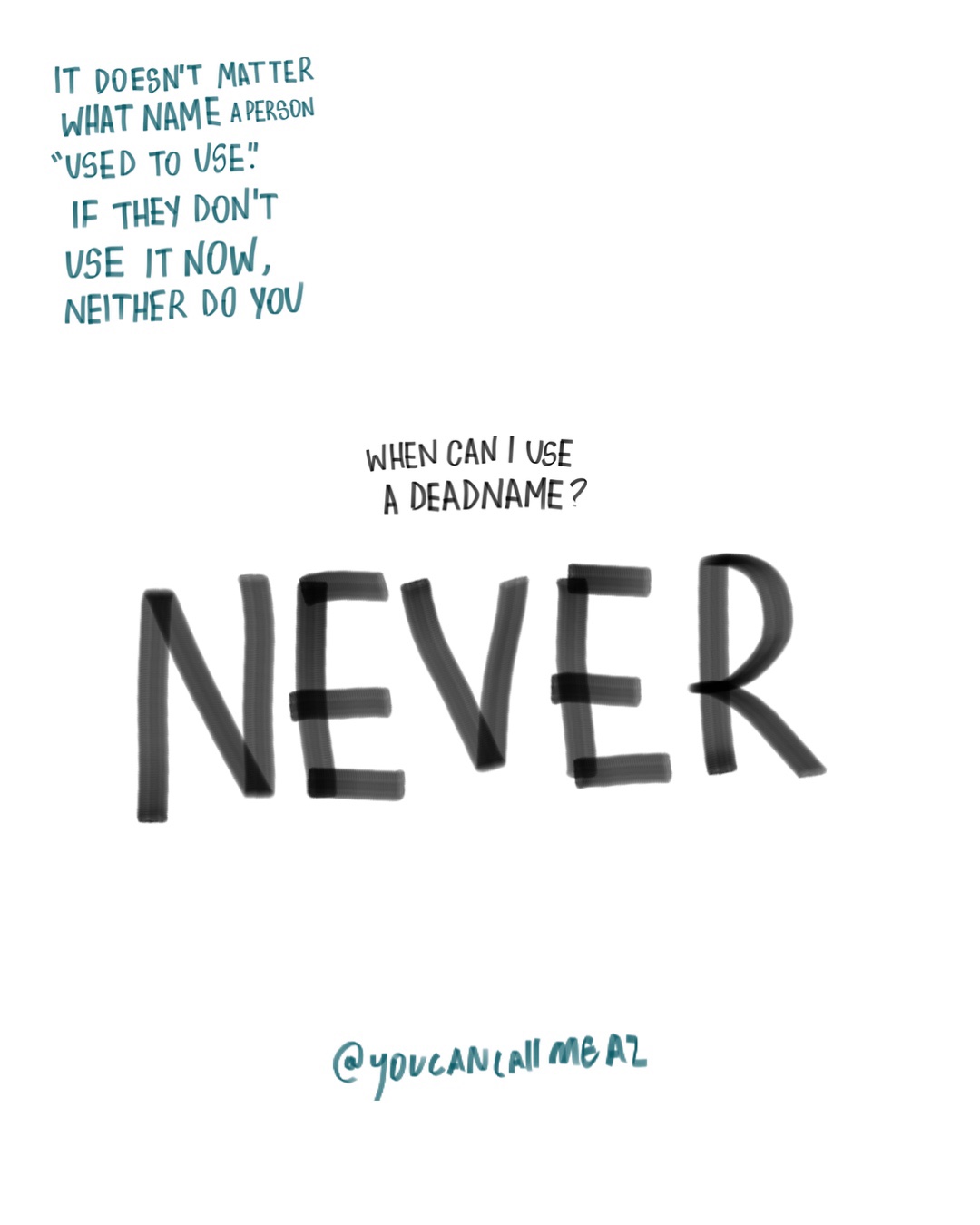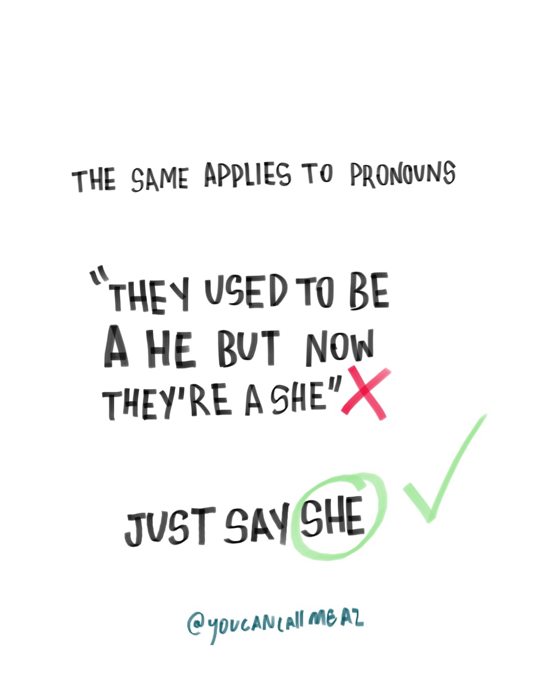 - eg. instead of saying “my friend, who used to be called Sam but is now called Samantha” / “i knew them as Sam but now they’re called Samantha”