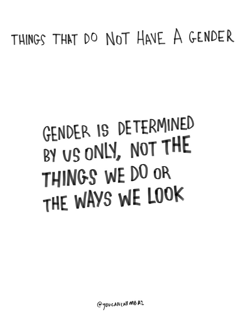 Let’s stop gendering things that don’t have a gender Posted byAz FrancoMarch 1, 2022October 26, 2022Posted intrans rights [part 2] gender is determined by us only, not the things we do or the way we look. Share this:TweetLike Loading...