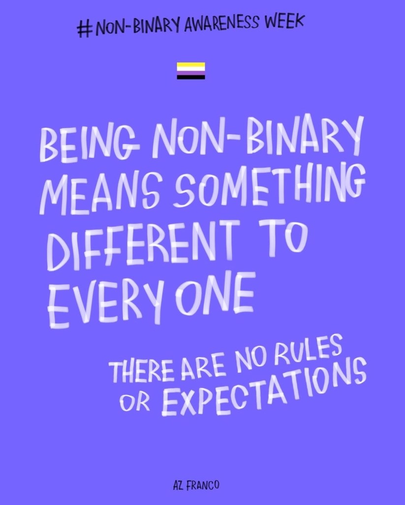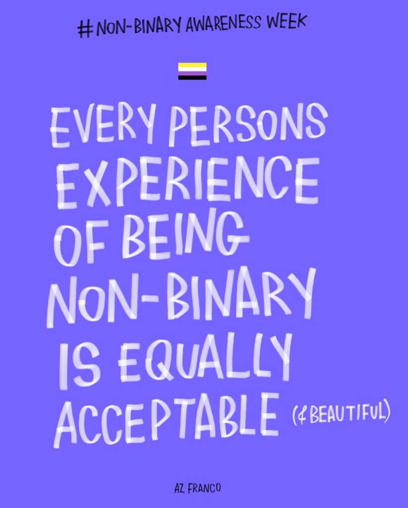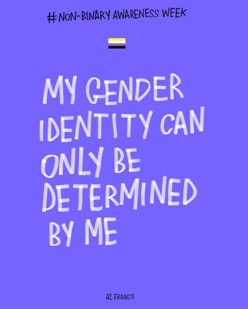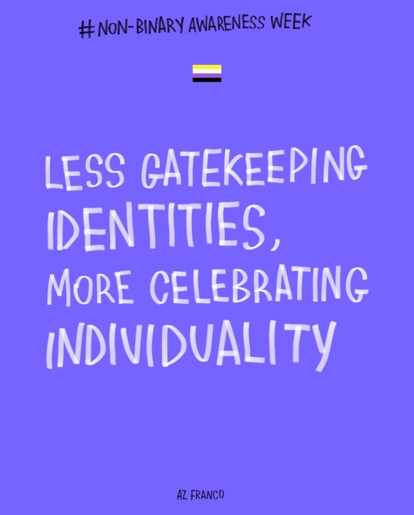 Non Binary Awareness Week! Posted byAz FrancoJuly 14, 2022October 26, 2022Posted intrans rights Less gatekeeping identities, more celebrating individuality. #NonBinaryAwarenessWeek #NonBinaryAwarenessWeek2022 Share this:TweetLike Loading...