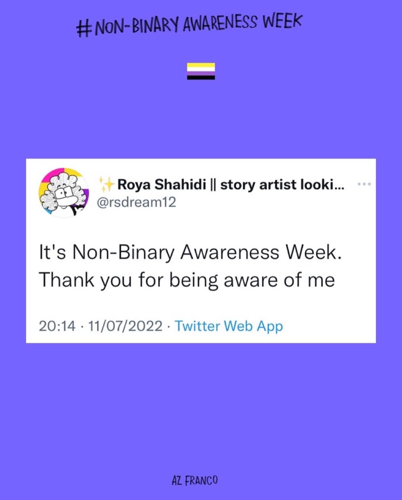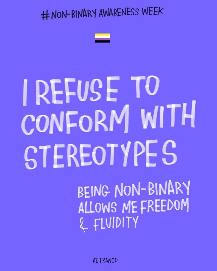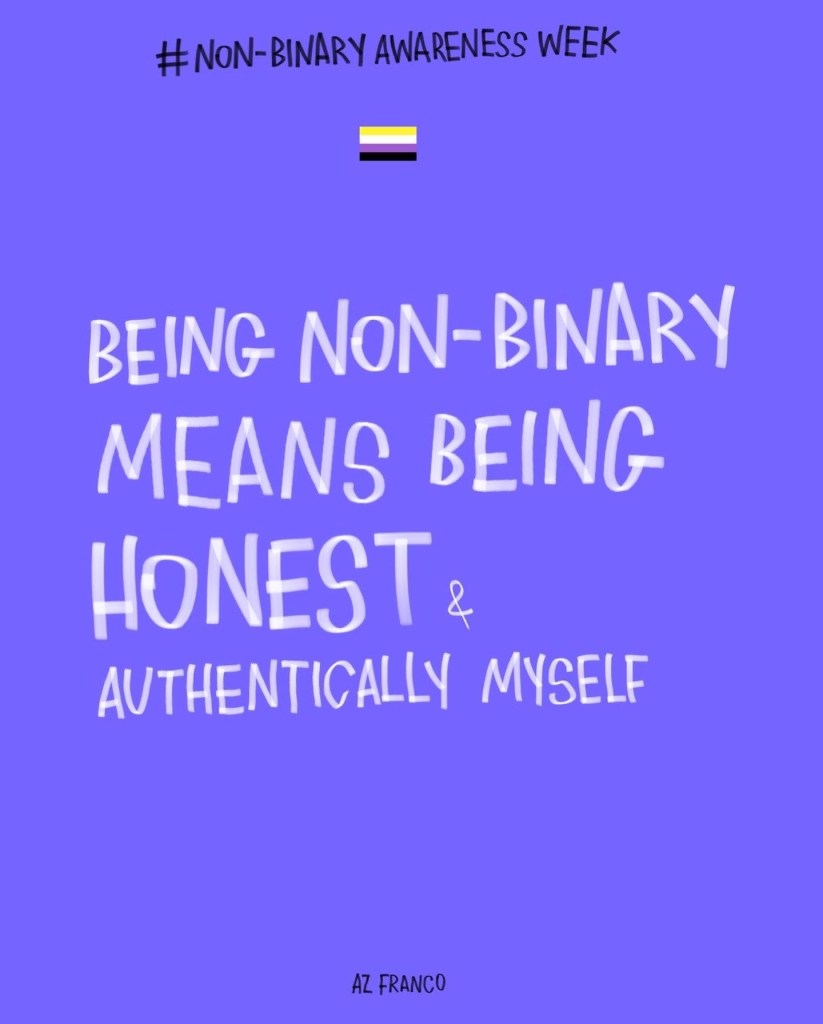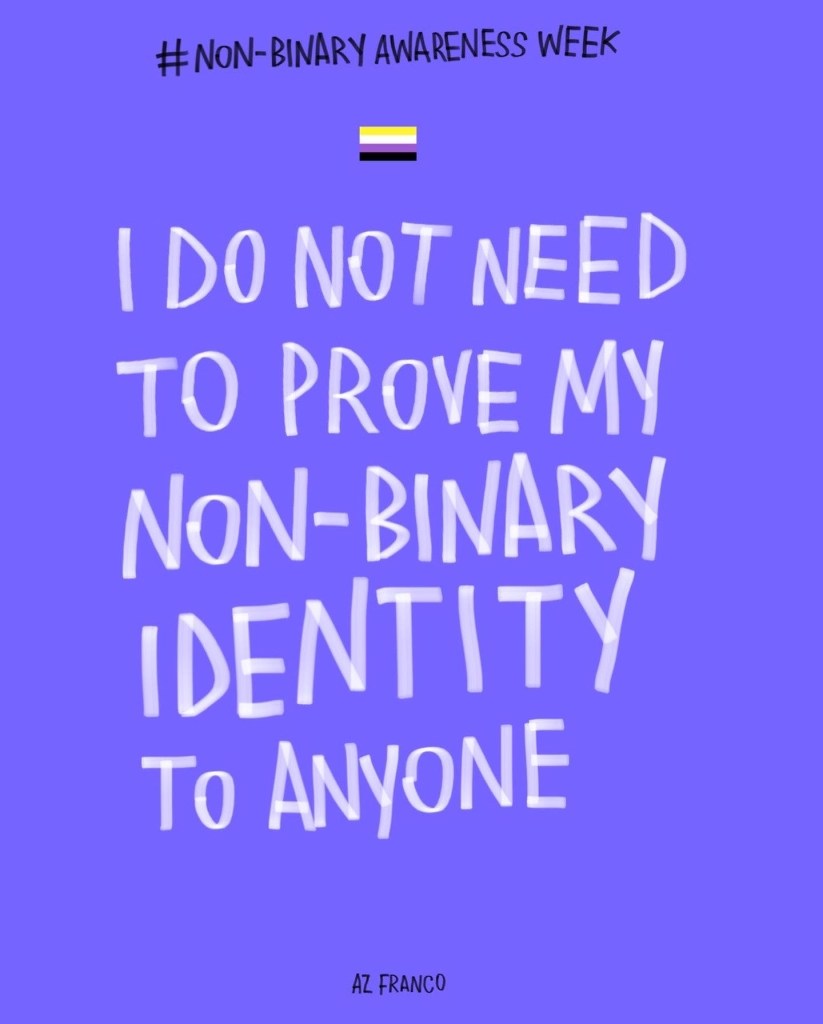 Non Binary Awareness Week! Posted byAz FrancoJuly 14, 2022October 26, 2022Posted intrans rights Less gatekeeping identities, more celebrating individuality. #NonBinaryAwarenessWeek #NonBinaryAwarenessWeek2022 Share this:TweetLike Loading...