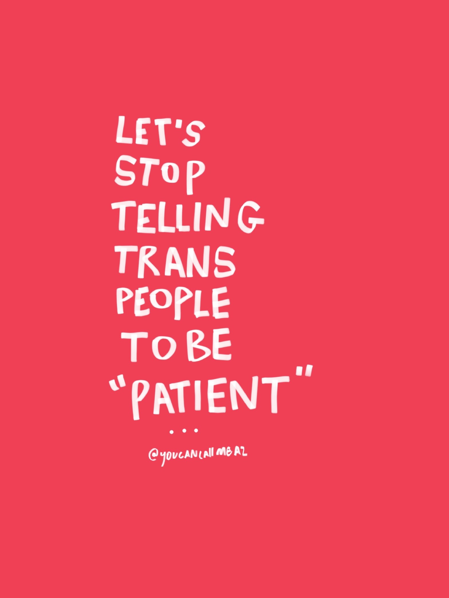 since I first remember questioning my gender identity, I’ve had to be patient. I’ve had to wait to connect with myself, to see myself, to BE myself. waiting & being patient is something we, as trans people, often have to do. we spend what feels like LIFETIMES being patient. & although intentions may not beContinue reading “LETS STOP TELLING TRANS PEOPLE TO BE PATIENT”